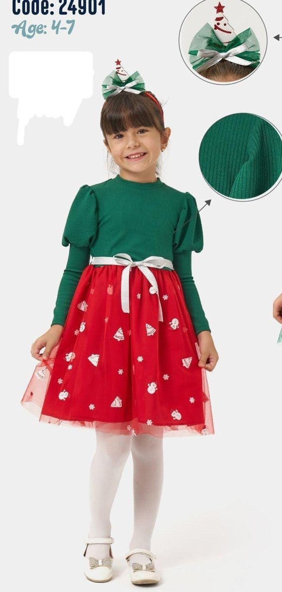 Kız çocuk balon kollu, bisiklet yaka, renkli kırmızı nakışlı desenlere sahip, beli fiyonk kemerli, şık yılbaşı elbisesi.