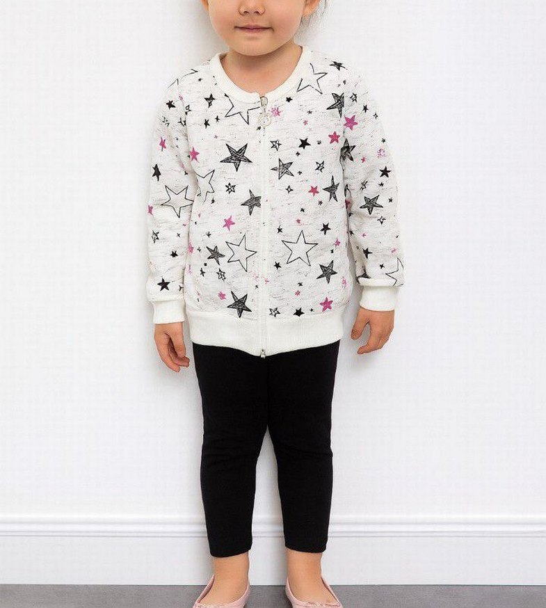 Kız çocuk için pamuk dokulu, uzun kollu, yuvarlak yakalı, beyaz ve gri yıldız desenli, yumuşak dokulu sweatshirt. Önden fermuarlıdır. ⭐