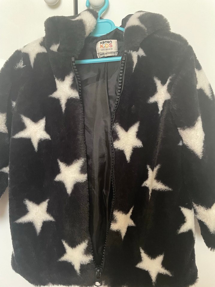 Kız çocukları için yıldız desenli, kürklü siyah mont. Yumuşak ve sıcak fleece kumaştan, notched yakalı ve fit kesimle dikkat çeker. ⭐ Koton ürünü 4-5 yaş için uygundur.