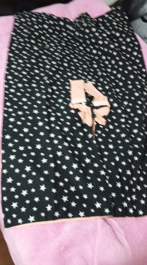 Koyu renkli yıldız desenli sentetik kumaştan yapılmış, pembe puset bebek arabası örtüsü. Yaka kısmı kesik detaylıdır.