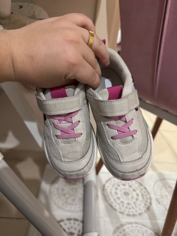 Kız çocukları için gri ve pembe renklerde, cırtlı kolay giyilen spor ayakkabılar. Kauçuk tabanlı, desen içermeyen sokak stili için uygundur.