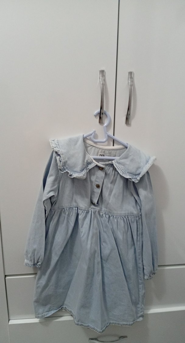 Bu kız çocuk elbisesi, bol kesim, uzun kollu, yakalı ve yumuşak kot kumaş orjinal yakası fırfır detaylara sahiptir.