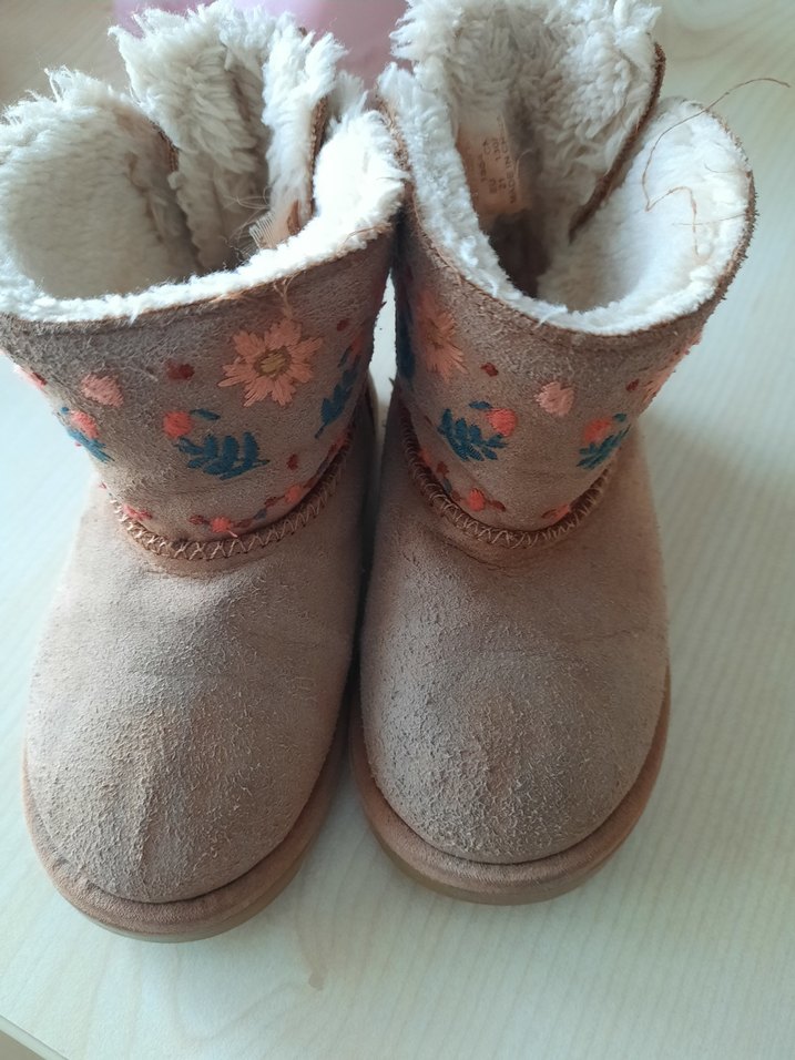 Kız çocukları için kahverengi botlar, yumuşak ve sıcak astar ile pastel nakışlı çiçek desenleri ve kürk detaylarına sahip, bohem tarzını yansıtıyor.