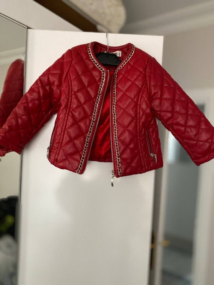 Kız çocukları için zincir detaylı, nakış desenli, kırmızı deri biker ceket. Parlak yüzeye ve kesimli yapıya sahiptir. 1,2 için uygundur