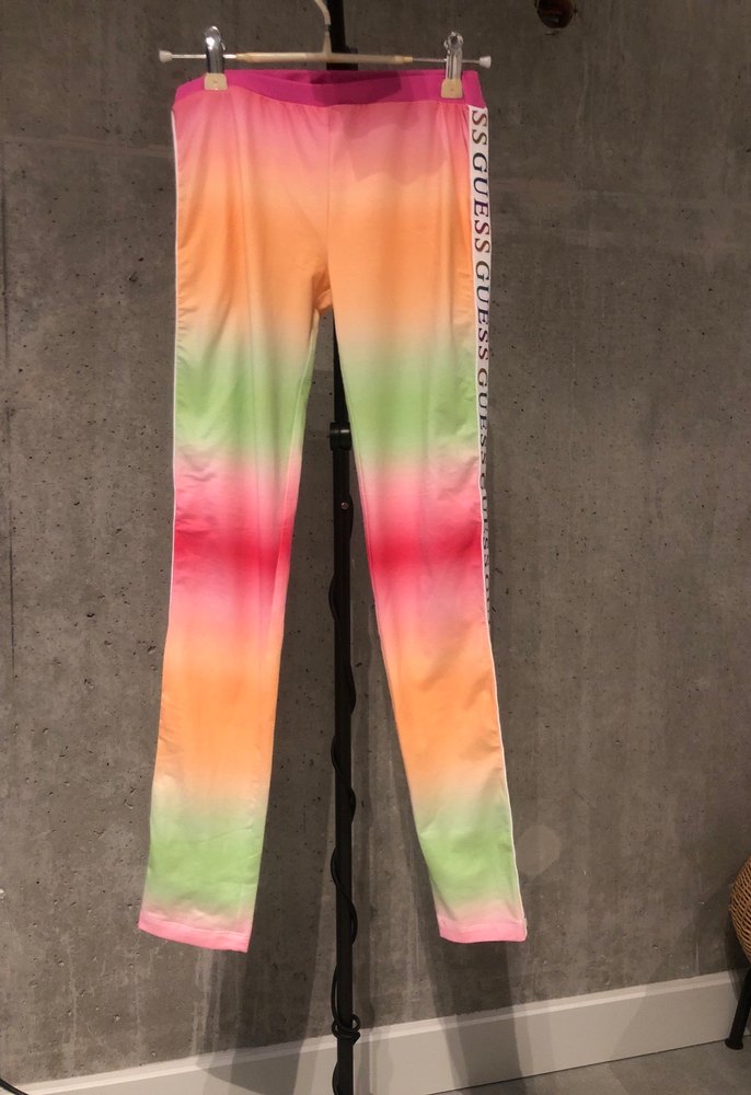 Elastik bel bantlı, çok renkli pastel tie-dye desenli kumaş kız cocuk tayt Sentetik kumaştan, midi boyda, spor ve sokak stiline uygun. Yan detay şık bir dokunuş katıyor.
