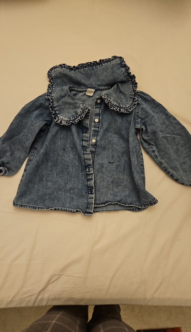 Geniş kesim kız çocuk denim gömlek, düğmeli ve fırfırlı yakalıdır. H&m marka 3-4 etiketli ancak 5 yaşa kadar olur geniş kalıp