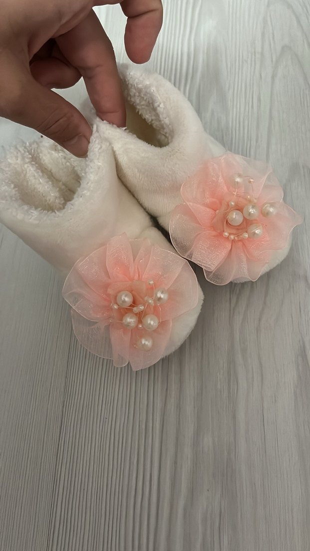 Beyaz, yumuşak ve sıcak kumaştan, kürk detaylı kız çocukları botları. Pastel renkli, inci süslemeli çiçek deseni bulunur. Geleneksel tarzda.