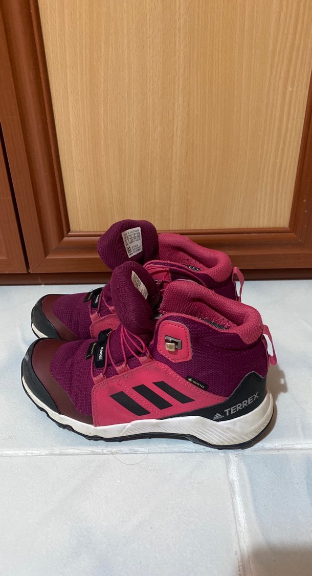 Koyu pembe, baskılı desenli kız çocukları için spor ayakkabı. Kauçuk tabanlı ve cırt cırtlı bantlı. Trendy rahat sokak stili için uygun.