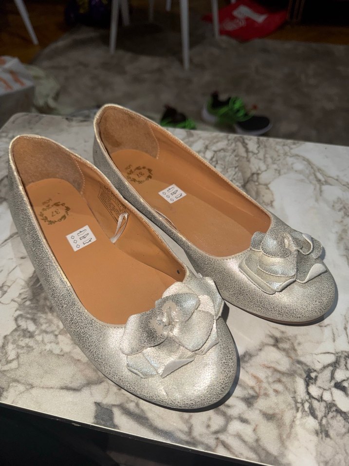 Altın renkli, metal tokalı ve çiçek desenli kız çocukları için klasik ve modern babetler.