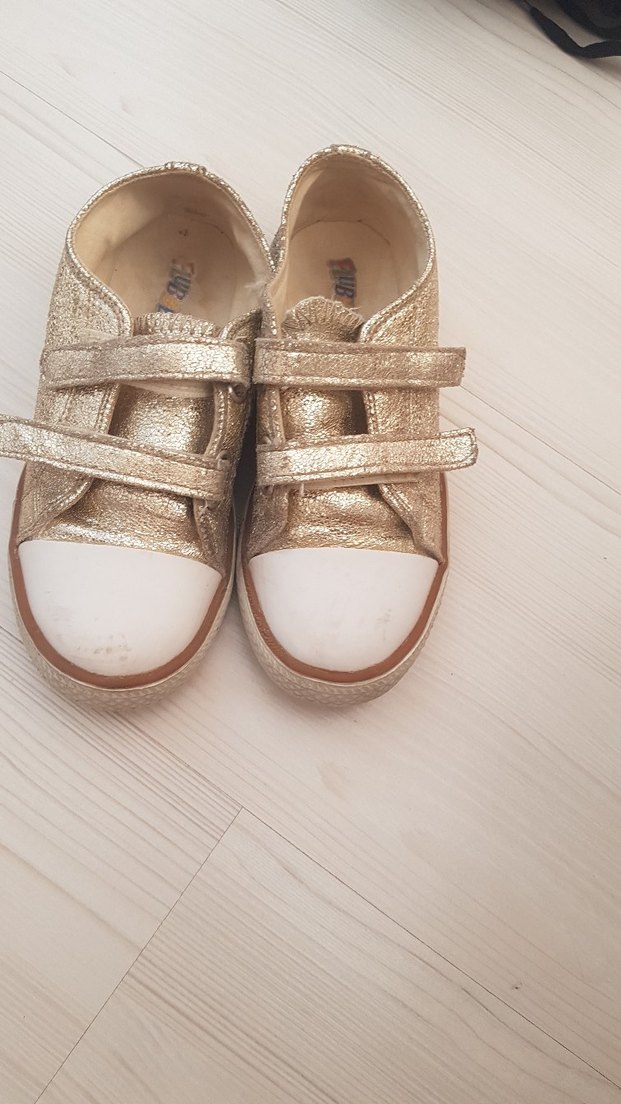 Cırt cırtlı, lastik tabanlı, parlak altın renkli kız çocukları için spor ayakkabılar. Düz ve desen içermeyen sokak tarzı.marka temsilidir