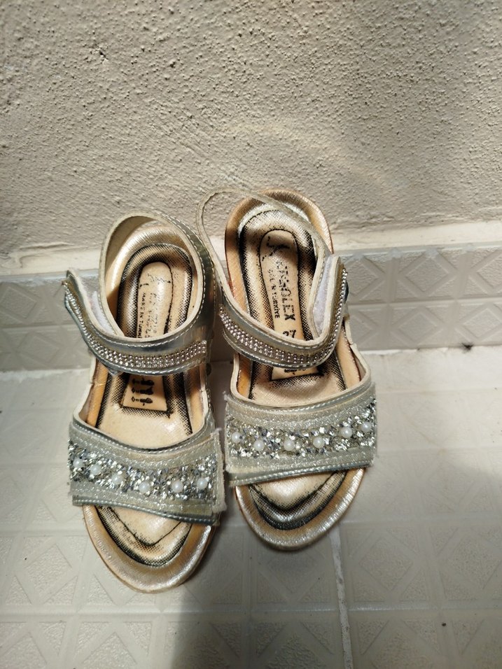 Altın renkli, tokalı ve işlemeli detaylara sahip kız çocukları için parlak kauçuk sandalet. 27 numara fakat 25.26olur