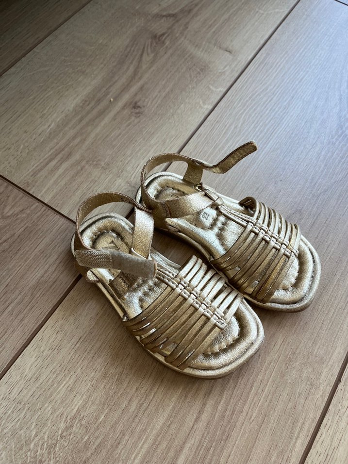 Altın renkli, parlak görünümlü kız çocukları için tokalı terlik. Kauçuk malzemeden yapılmış, bohem tarzda rahat ve şık. Sadece doğum gününde bir kez giyildi