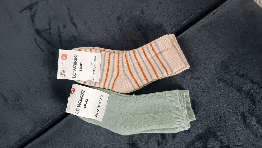 Bej ve pastel yeşil renklerde kız çocukları için yumuşak ve sıcak çoraplar. Bir çift ince çizgili, diğer düz desensiz. Rahat ve konforlu kullanım sağlar. 3 4 yaş 4lu