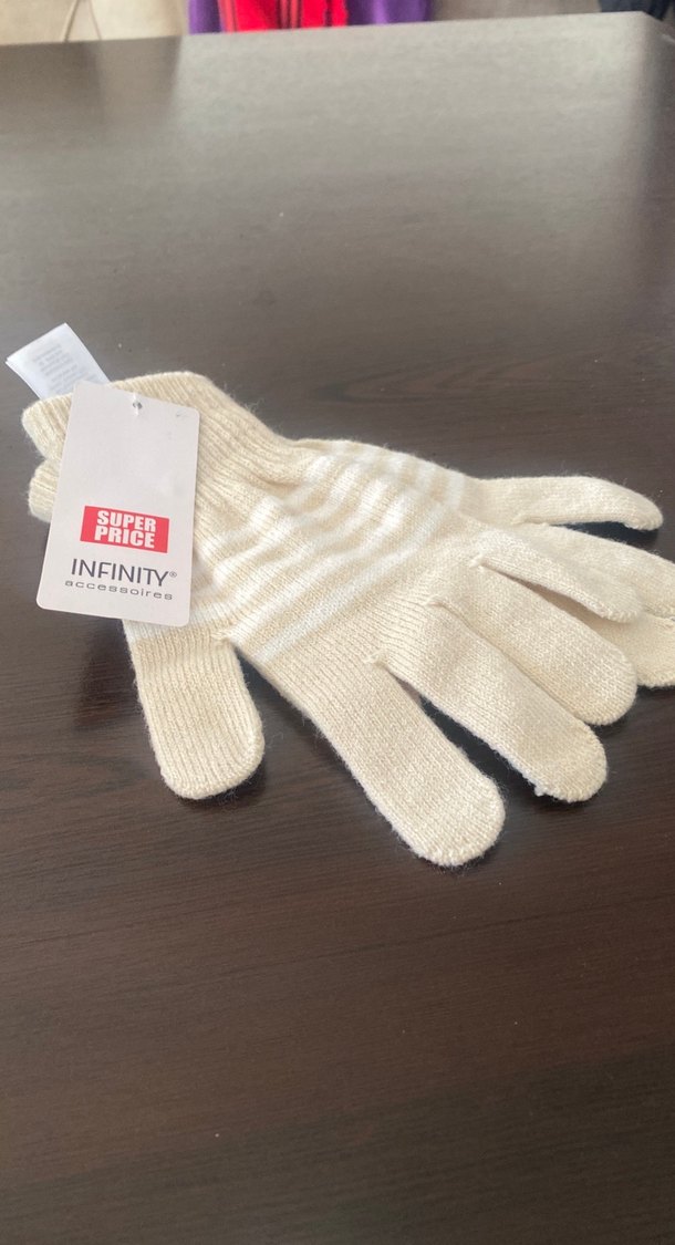 Yumuşak yünden örülmüş, düz beyaz kız çocuk eldivenleri. Desensiz ve INFINITY markalıdır. 10/12yqş