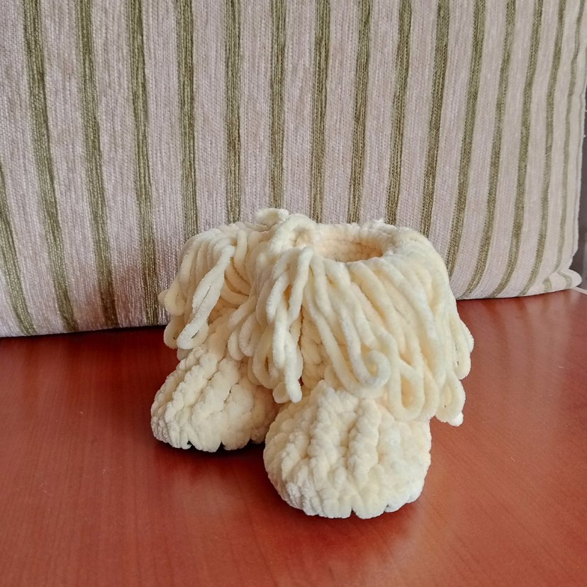 Kız çocukları için sarı, örgü yünden yapılmış sıcak ve yumuşak dokulu ev terliği, bohem tarzıyla dikkat çekiyor.