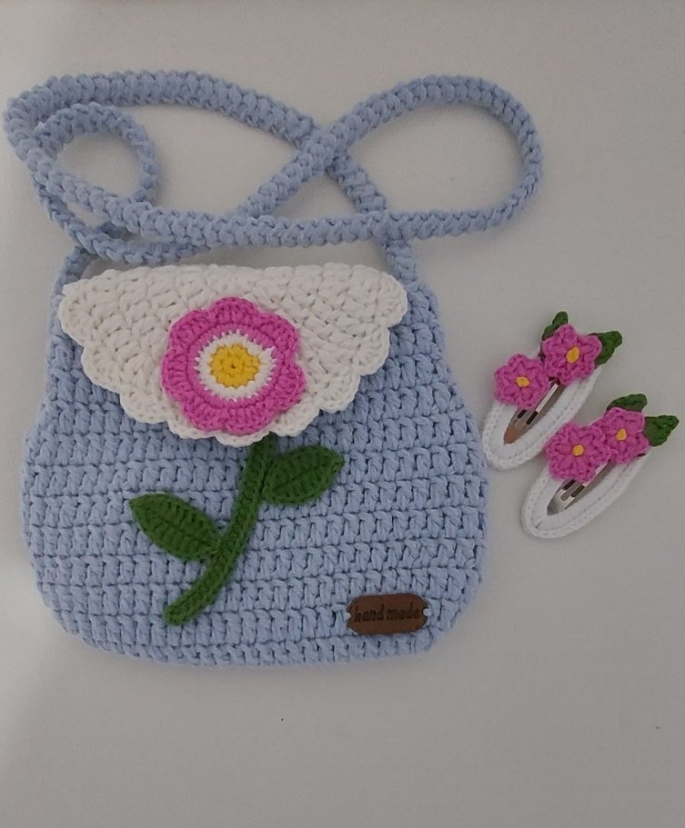 Kız çocukları için Çiçek Desenli Örgü Kız Çantası ve Toka Seti