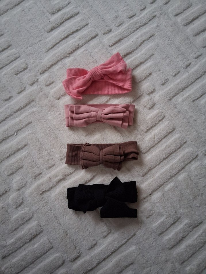 Koyu tonlarda, yumuşak kumaştan yapılmış, fiyonk detaylı kız çocukları için saç bantları.