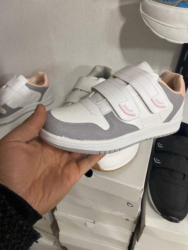 Kız çocukları için beyaz ve gri renkli, cırt cırtlı spor ayakkabı. Kauçuk tabanlı, sokak stili için uygun ve dayanıklı.