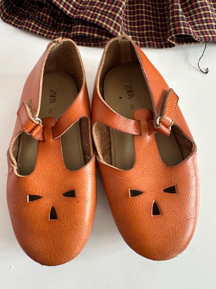 Parlak kahverengi deri kız çocukları babeti, tokalı bantlı ve ön kısmında basit kesik detayları bulunan ZARA marka.