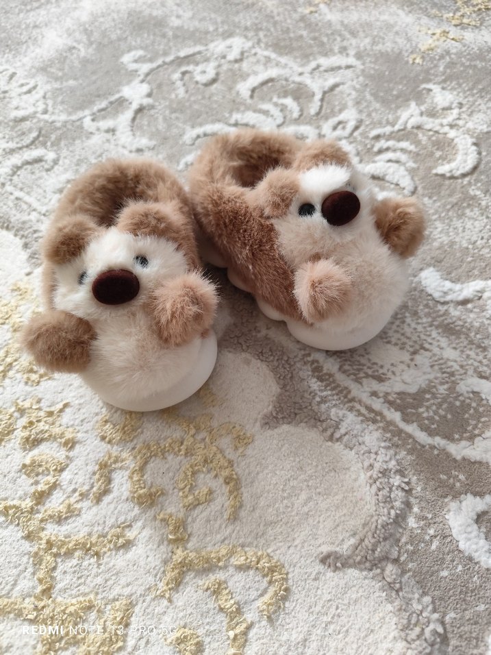 Kız çocukları için kahverengi, yumuşak kürk detaylı ve nakışlı desenli sıcak terlik. Rahatlık için yumuşak kumaştan üretilmiştir. hiç kullanılmadı.. yenidir.. 22-23cm