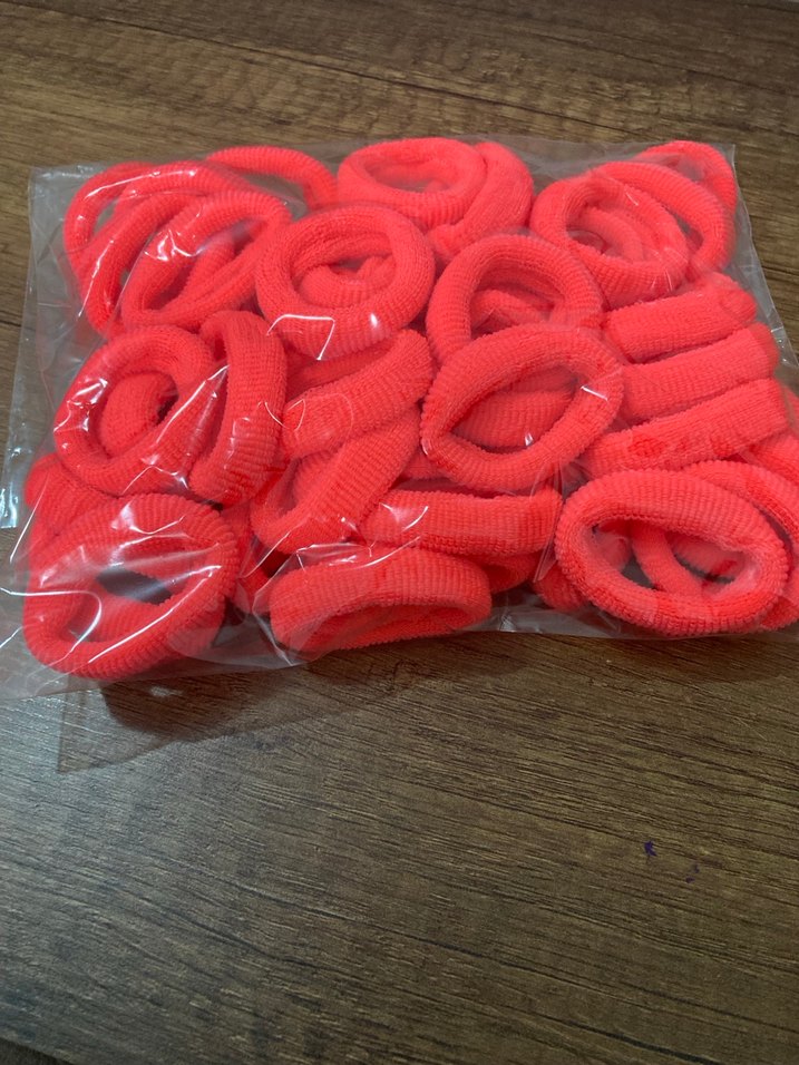 Renkli kırmızı lastikli saç tokaları, çocukların saçlarını sabitlemek için basit ve rahat bir kullanım sunar. Düz ve desen içermeyen tasarıma sahiptir. Paket 50 adettir