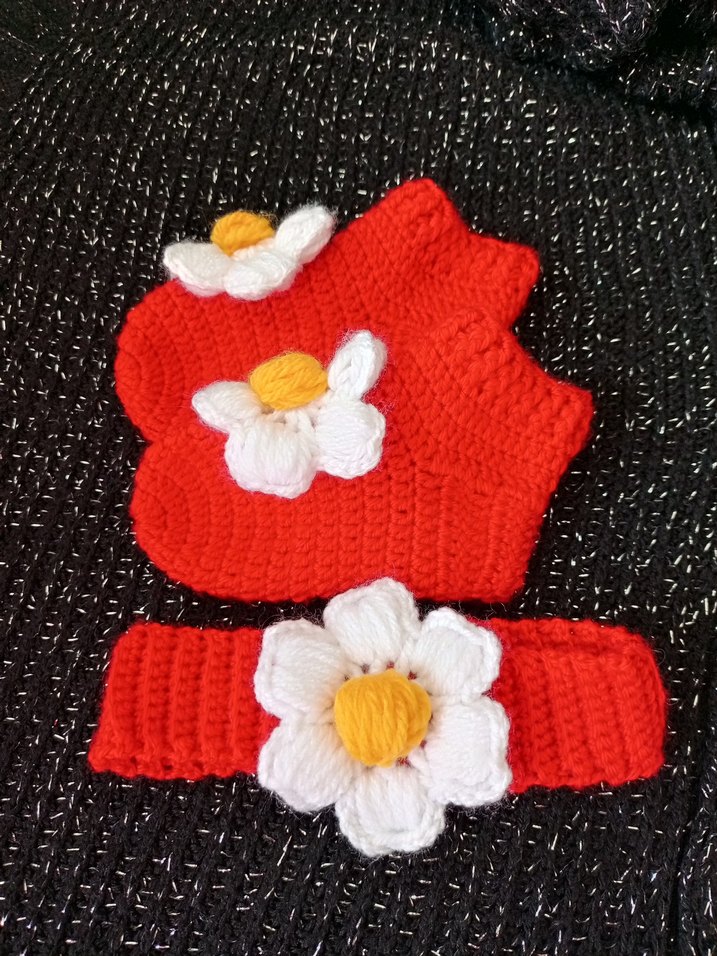 Kız çocukları için kırmızı renkli, nakışlı beyaz çiçek detaylı örgü patik ve bandana seti. Bohem ve retro tarzda, yumuşak ve sıcak tutan örgü kumaş. istediğiniz renk ve bedende yapılır.