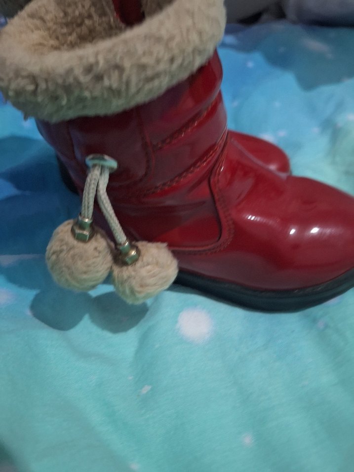 Kız çocukları için renkli kırmızı lastik bot, üst kısmında kürk detayları ve yanlarda süsleme olarak kürk ponponlar bulunur.