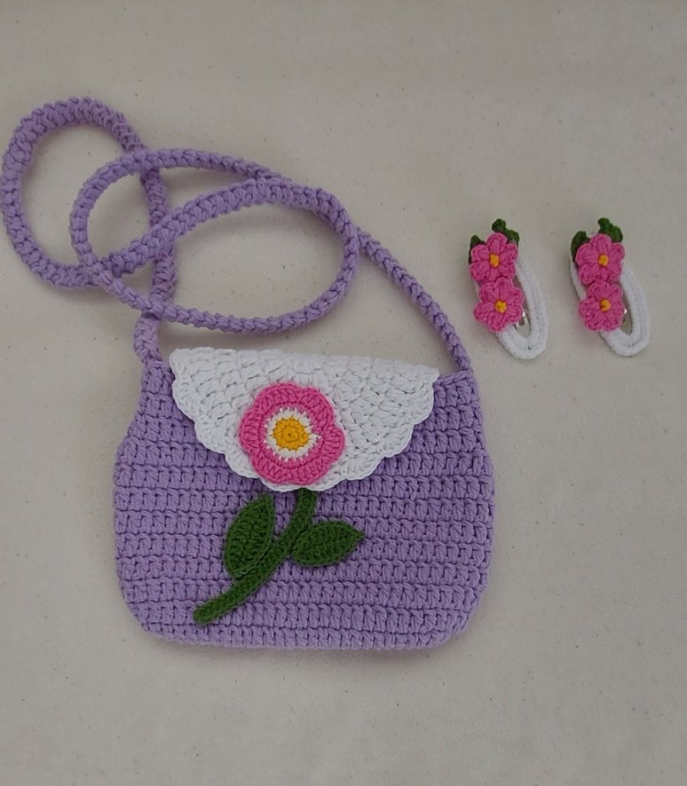 Mor renkte örgü çanta, kapağında pembe çiçek deseni bulunan çanta ve uyumlu çiçekli toka seti.Kendi el emeğimdir coton iple örüldü elimde mevcuttur
