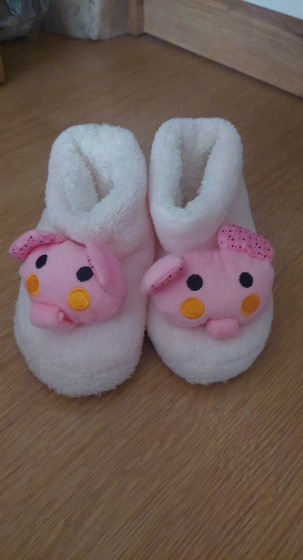 Yumuşak ve sıcak polar kumaştan, renkli nakışlı domuz figürlü kız çocukları için örgü sıcak ev terlikleri.