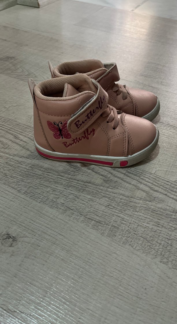 Velcro bantlı, baskılı kelebek desenli pastel açık pembe kız çocukları sneakerı. Kauçuk tabanlı, rahat sokak stili ayakkabı. 'Brittarfly' yazısı bantta yer alıyor. Çok az kullanılmıştır yepyeni