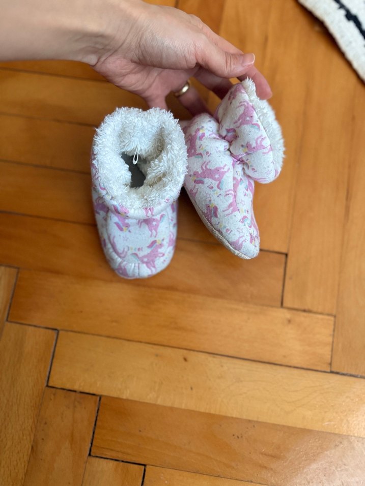 Kız çocukları için peluş detaylı, yumuşak kumaştan yapılmış pembe ev terlikleri. Bohem tarzda, bağlama desenlidir.