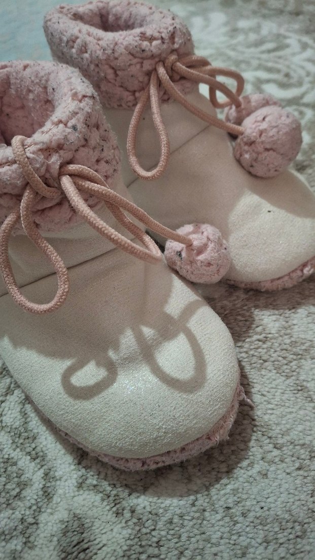 Kız çocukları için peluş detaylı, yumuşak kumaştan yapılmış pastel pembe ev terliği. Ponponlu bağcıklarıyla sade ve rahat bir tasarım sunar.
