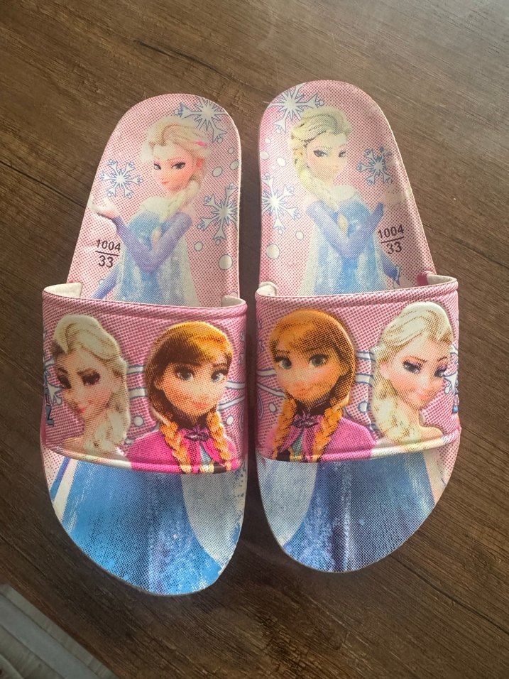Pembe renkli, baskılı Frozen karakterleriyle süslenmiş, tokalı kauçuk kız çocuk terliği. Pastel tonlar ve pop kültür stiliyle retro ve bohem havası verir. ❄️