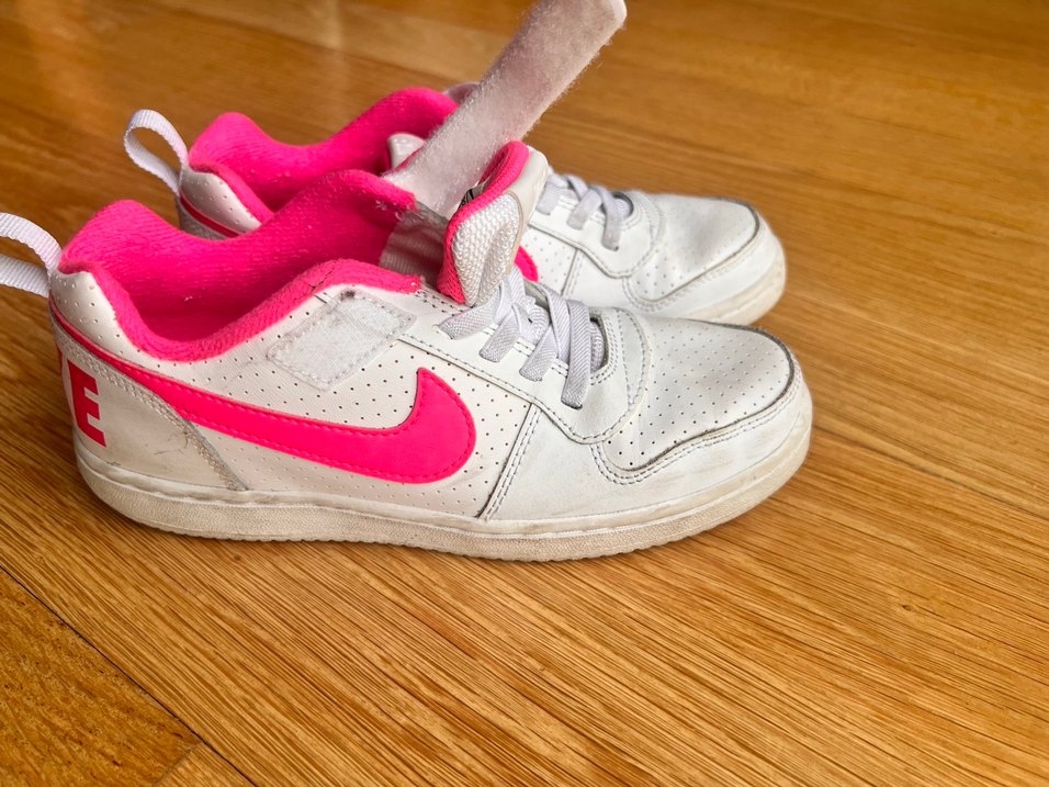 Nike 34 numara kauçuk tabanlı, cırt cırtlı ve pembe detaylı kız çocukları için spor ayakkabılar. Trend sokak stili için uygun.