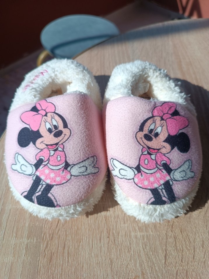 Kız çocukları için pembe, Minnie baskılı sıcak terlikler. Yumuşak, kürk detaylı iç kısmı ve konvansiyonel tasarımı vardır.