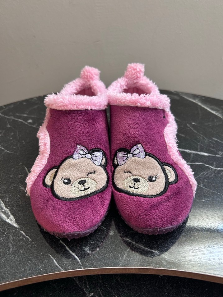 Yumuşak tüylü kumaştan, nakışlı renkli ayıcık desenli pembe kız çocuk terliği. Kürk detayları ekstra rahatlık sağlar.