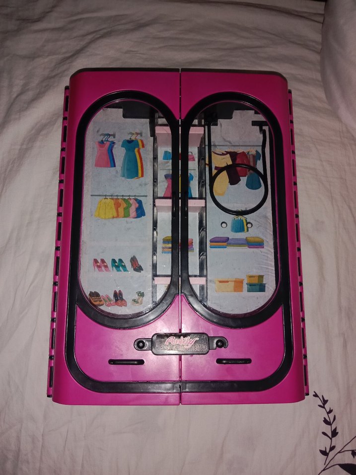 Çift kapaklı, pencere detaylı koyu pembe oyuncak dolap. İçinde renkli mini elbiseler ve aksesuarlar bulunur.