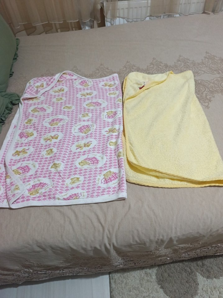 Yumuşak ve sıcak kumaştan yapılmış pembe pastel kız çocukları bornozu ve sarı havlu. Banyo sonrası kullanım için uygundur.