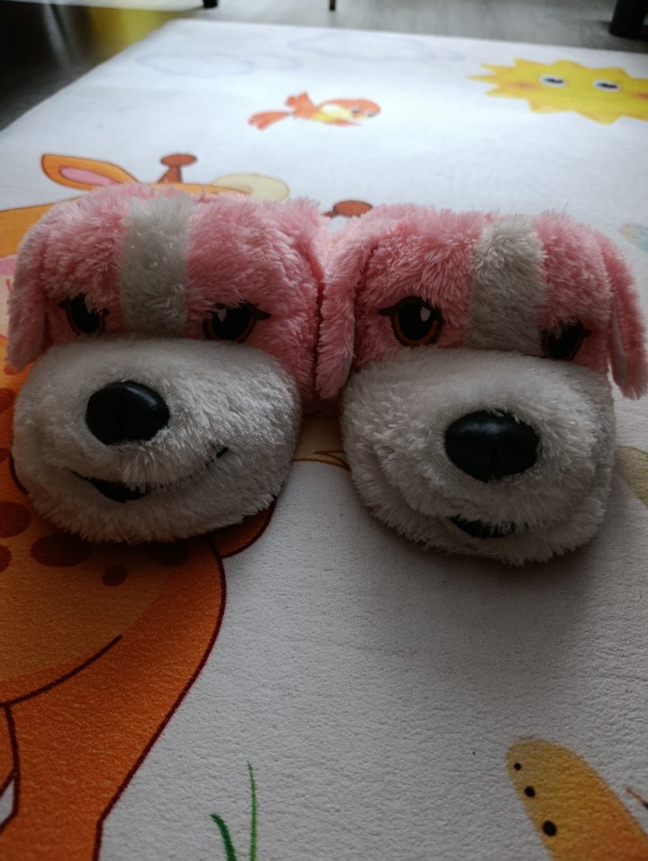 Renkli, pembe, yumuşak peluş kumaştan yapılmış, sevimli köpek yüzlü kız çocukları için sıcak terlikler. 33/35 no uyumlu
