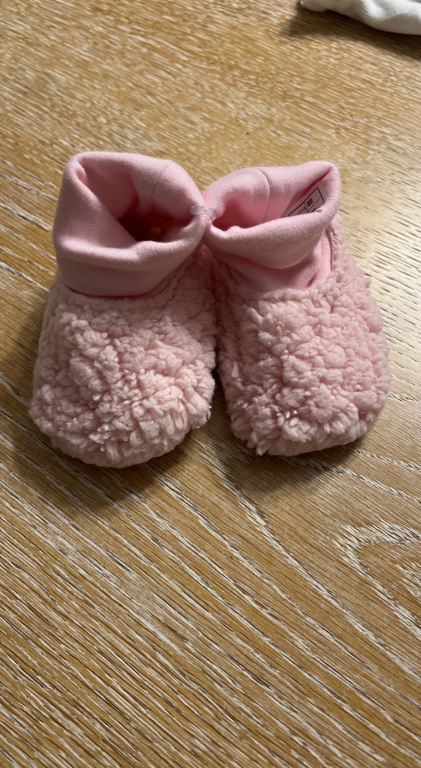Yumuşak, kürk detaylı pembe kız çocukları için terlikler. Rahat ve sıcak tutan peluş malzemeden yapılmıştır. Düz, pastel renklidir.