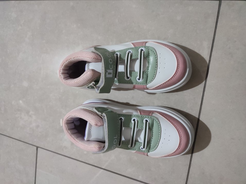 Pembe ve yeşil renklerde, cırt cırtlı ve baskılı desenli, kauçuk tabanlı kız çocukları için günlük sneakers. Ürün hiç kullanılmadı