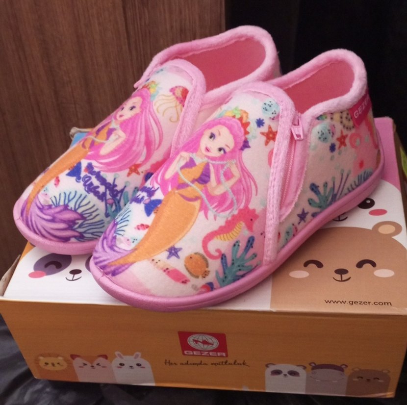Renkli denizkızı desenli, sentetik kumaştan yapılmış ve kolay giyimi sağlayan cırt cırtlı kız çocuk terliği. 27-28-29-29numara mevcut