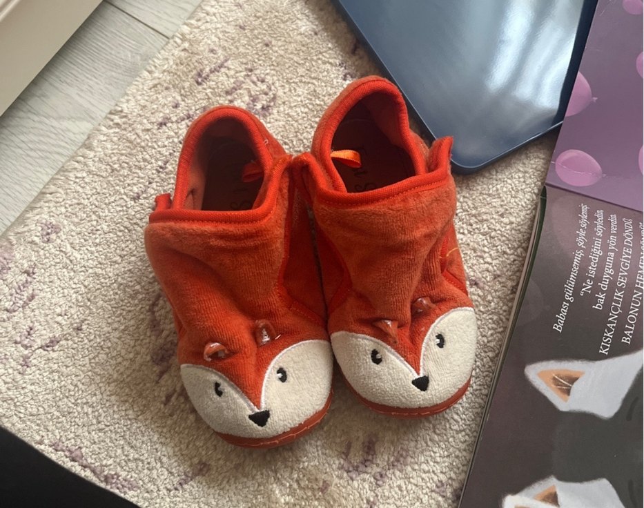 Kadife malzemeden yapılmış, renkli tilki baskılı, cırt cırtlı erkek çocukları için sıcak terlikler.