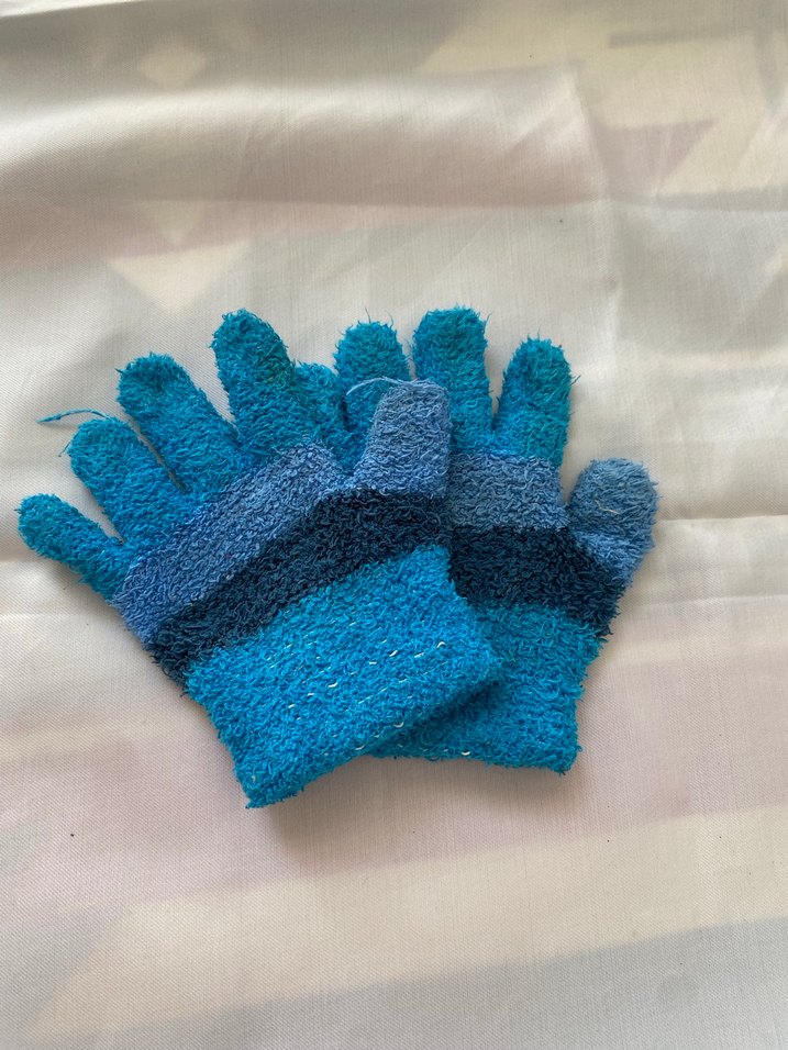 Kız çocukları için renkli, örgü ve yumuşak dokulu mavi tonlarda çizgili eldivenler.