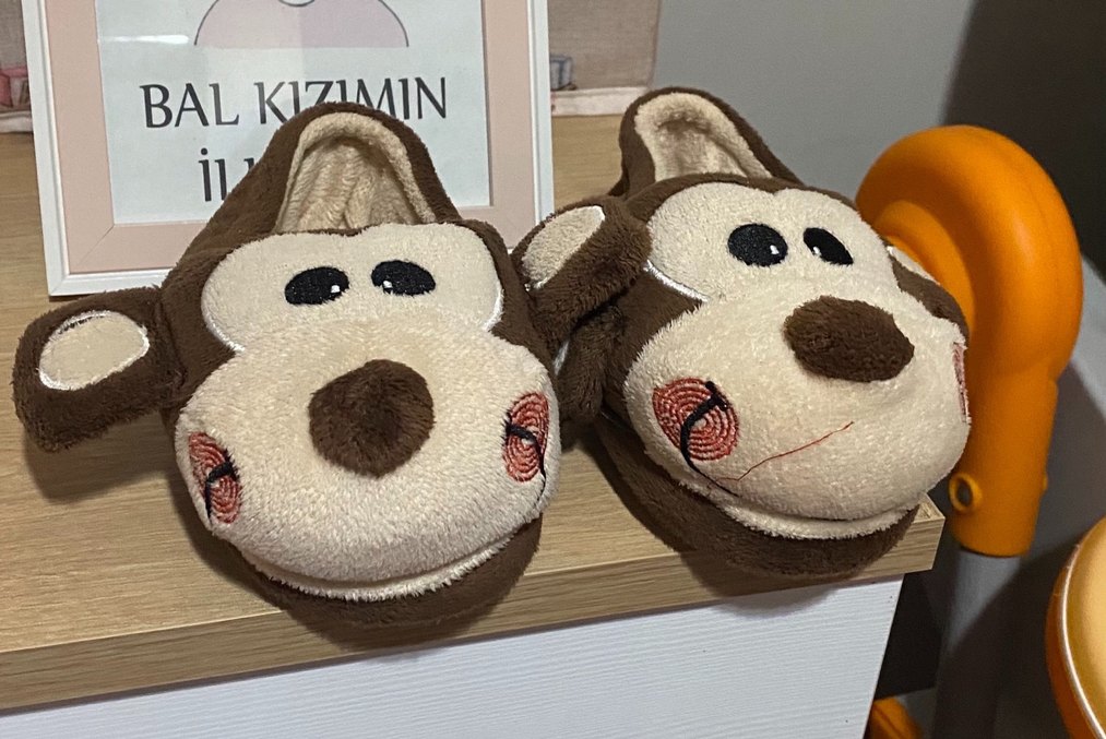 Kız çocukları için kahverengi, nakışlı maymun figürlü, yumuşak kürk detaylı ve rahat kumaştan yapılmış sıcak terlikler. Bohem, hippie ve retro tarzda, ZIMIN markalı.