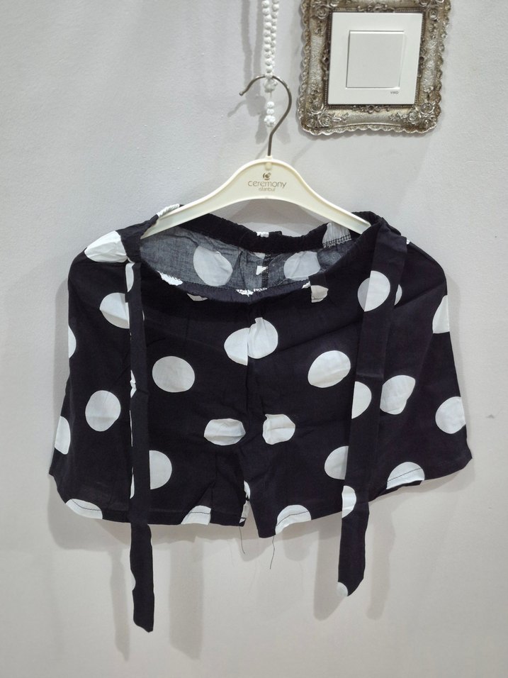 Pamuklu, kısa kollu, bol kesim siyah crop top, beyaz puantiye desenli. Düğmeli ve halter yaka detaylı, rahat sokak stili için uygundur.