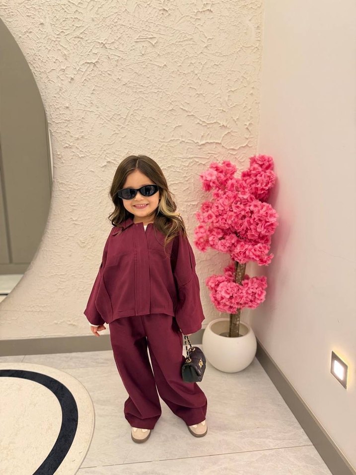 Bordo renk salaş kesim kız eşofman takımı, yakasında kesik detay ve koyu tonlu batik desenle, yumuşak ve sıcak kumaştan üretilmiştir. Dokuma kumaş Tam kalıp 34 45 56