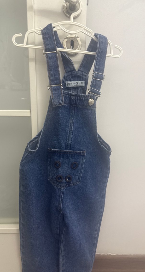 Askılı, tokalı ve ön cepli mavi denim tulum. Sokak tarzına uygun, desen içermeyen klasik tasarım.