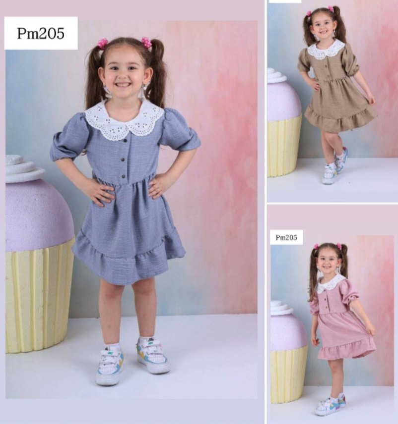 , kısa kollu, yaka ve fırfır detaylı bol kesim kız elbisesi. Hafif batik desenlidir.