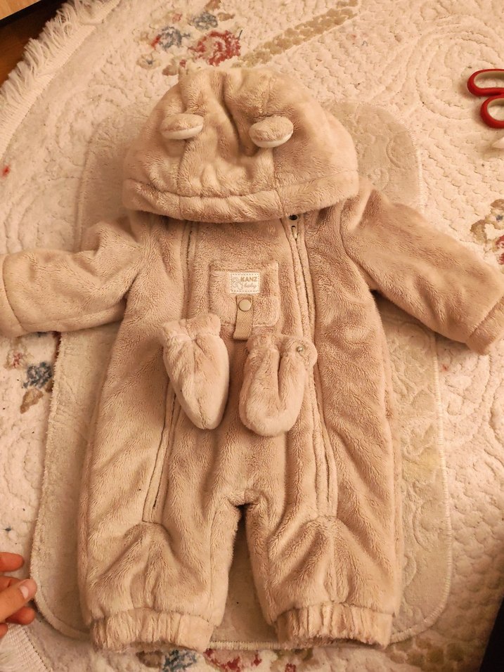 Bej renkli, yumuşak kürk kumaşlı kız bebek tulumu. Kulaklı kapüşon ve eldiven detayı ile sıcak tutar. Pastel ve desensiz tasarım. ❄️